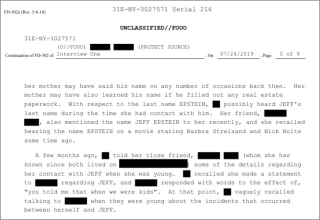 The anonymous victim was interviewed four times by the FBI in 2019. She claimed to have been sex-trafficked by the notorious predator Jeffrey Epstein and sexually abused by a variety of Epstein’s associates during the mid-’80s.