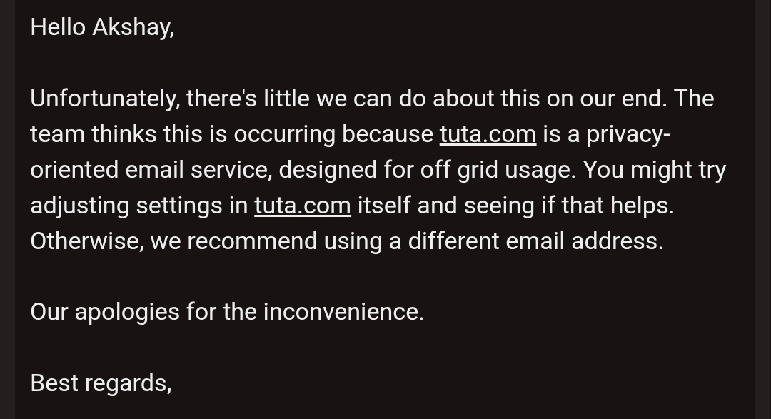 Hey @Tutanota do you know mubi.com considers tuta.com email addresses invalid? I tried to convince their customer support its their problem but they're giving me some resonse which makes no sense. Is there something y'all can do?