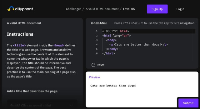 a11yphant is the easy way to learn the basics of web accessibility. Learn step by step by completing short, interactive coding challenges and quizzes.a11yphant.com
