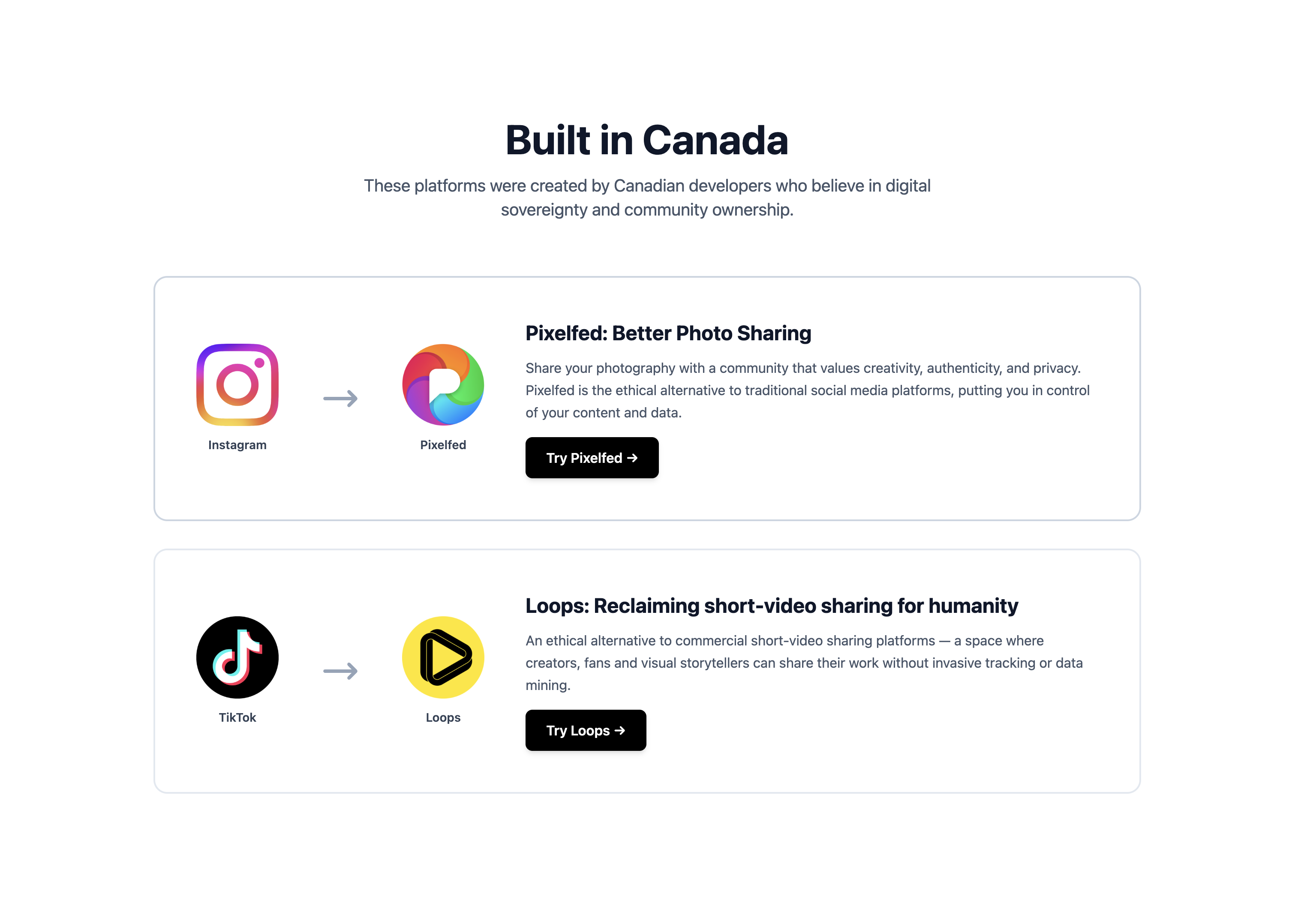 Discover Canadian-made social media alternatives like Pixelfed and Loops. Privacy-focused, open-source platforms built by Canadians who prioritize community over profit.Made in Canada.social