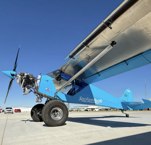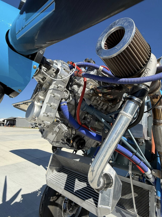 Runs a full-race Yamaha snowmobile (snow machine?) three-cylinder engine with massive turbocharger. Gets off the ground in about 30' and lands at 50' "if he does it right."