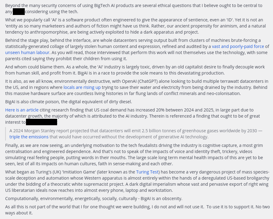 An enviro defense group reached out asking for my security take on using BigAI in activism work. After giving them the take (basically "don't"), I took liberty to talk about the ethics of using it in the first instance, especially in the context of human rights and climate activism.