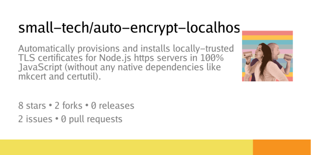 Automatically provisions and installs locally-trusted TLS certificates for Node.js https servers in 100% JavaScript (without any native dependencies like mkcert and certutil).Codeberg.org