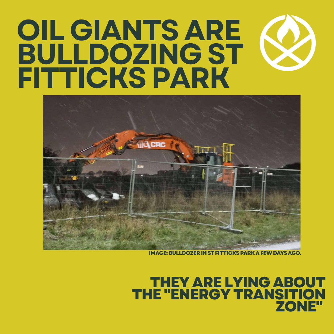A contractor has now set up to start the demolition of St Fitticks Park. All for a so-called "Energy Transition Zone" that is nothing but a cover for an oil billionaire to expand his fossil investments. (1/5)
