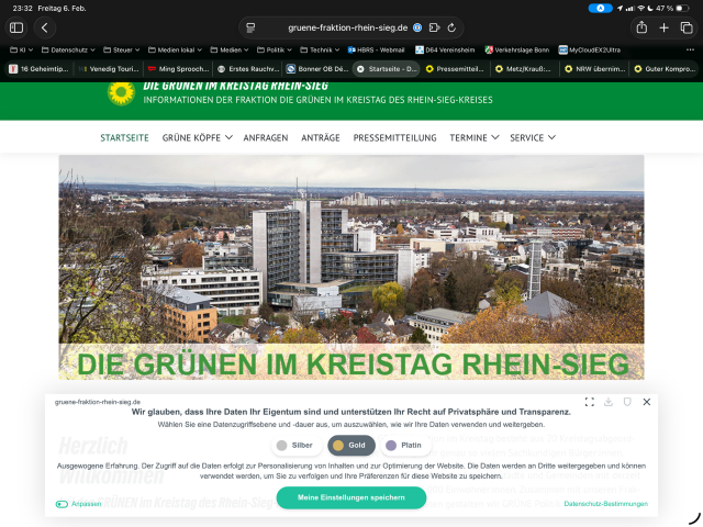 Die grüne Fraktion im Kreistag Rhein-Sieg hat den seltsamsten Cookie-Banner, den ich bisher gesehen habe. Technisch notwendige Cookies als „Silber“-Einstellung, mit Ausspäh-Werbe-Cookies dann aber „Platin“? Geht’s noch? Das ist nicht nur politisch daneben, sondern auch noch rechtswidrig.