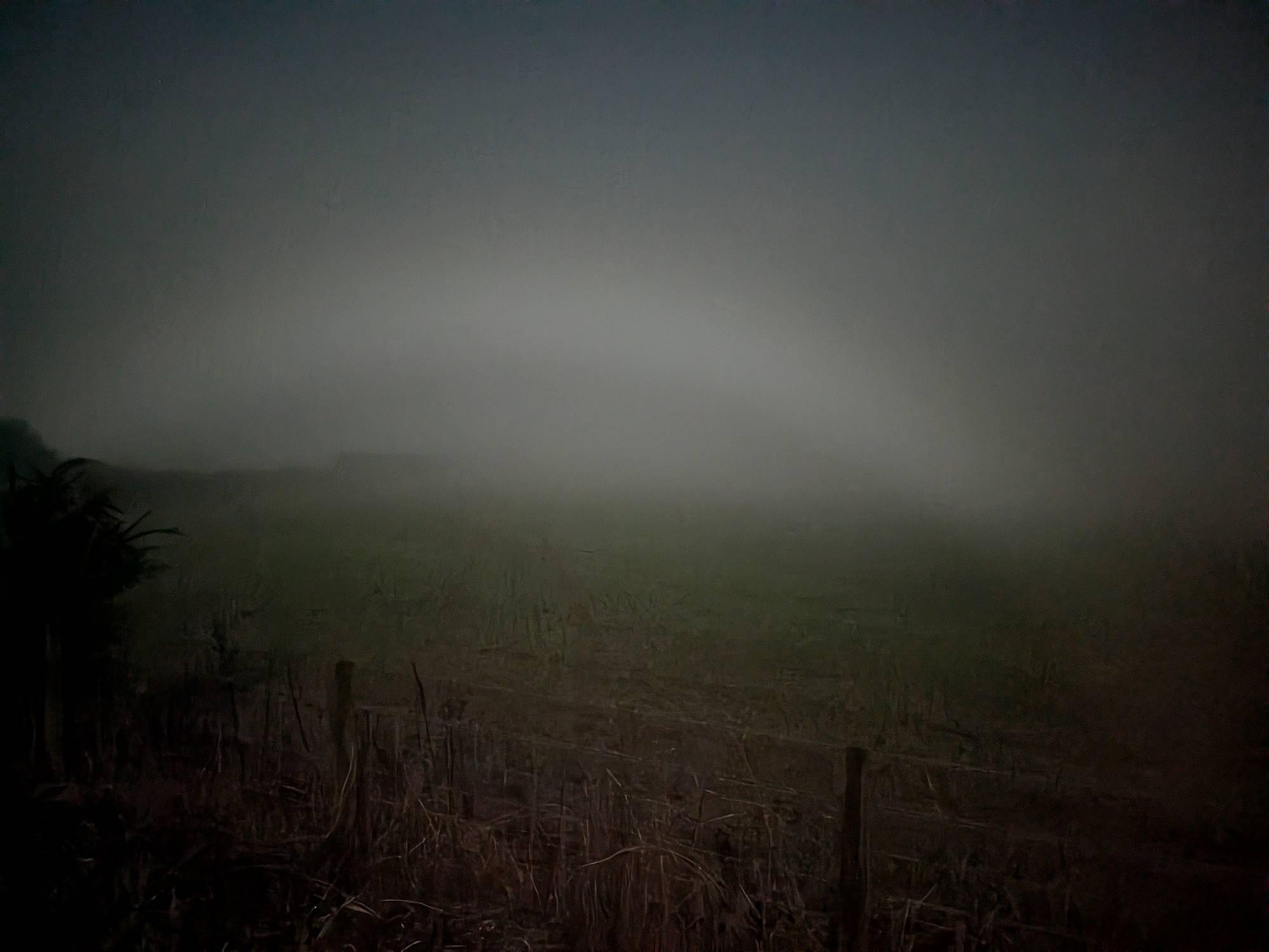 Evening walk after the rain. It was really foggy out. The photo isn't that great but it's of a lunar fog bow! Something I've never seen before. About 10pm night time with a big moon behind me. Moonlight is interacting with fine water droplets in the fog, creating a faint white arc.