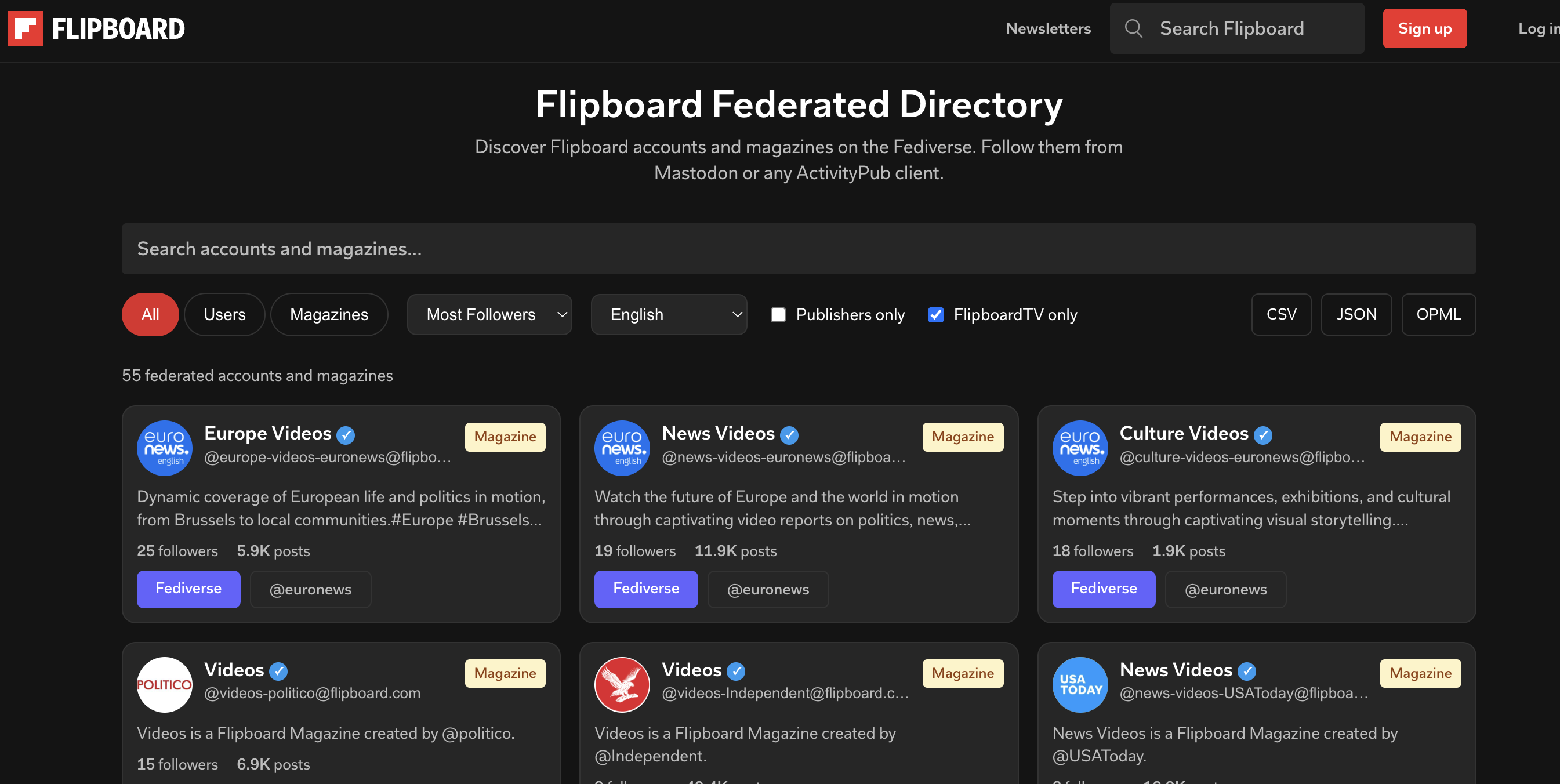 A great new toolset just opened up from @Flipboard enabling users to browser, sort, sift through literally thousands of federated "magazines," brand or org accounts, and fipboard TV accounts - all federating out and ready to copy and paste into your Fediverse app to follow.