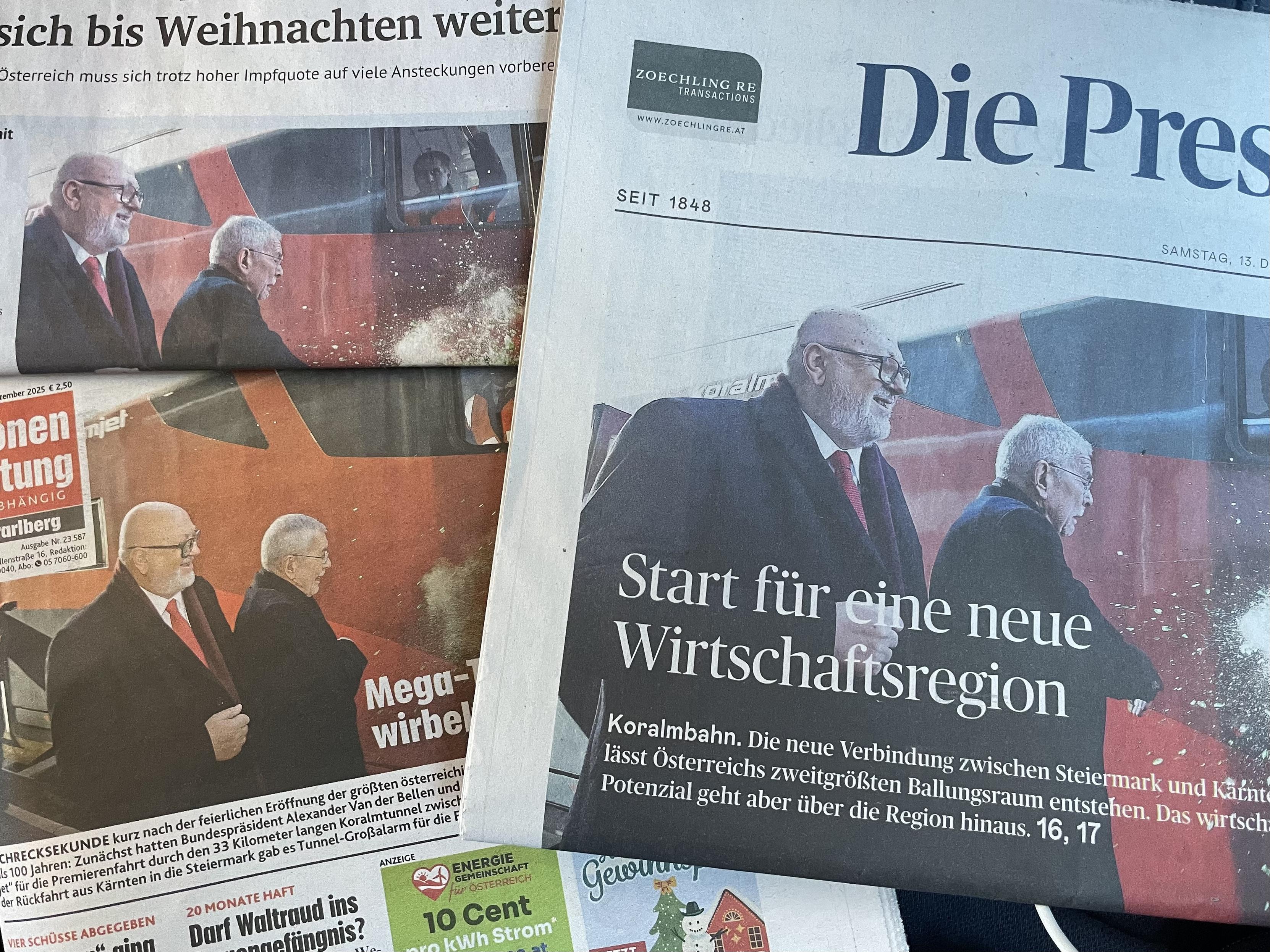 Todays front pages of the Austrian papers Krone, Kurier and Presse: Austria’s President Alexander Van der Bellen (who happens to be a frequent traveller on trains) christening the #ÖBB 🇦🇹 #Koralmbahn #Railjet train.