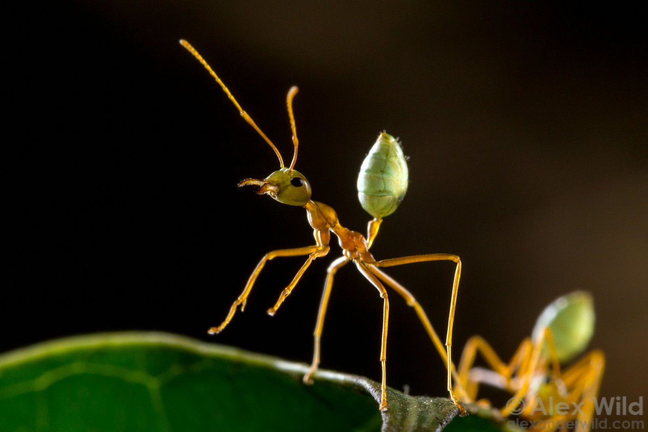 A green tree ant stands guard on a leaf nest. Oecophylla smaragdina. These little guys are everywhere in the humid tropics of southeast Asia and Australia and have a lemony flavor. Cairns.