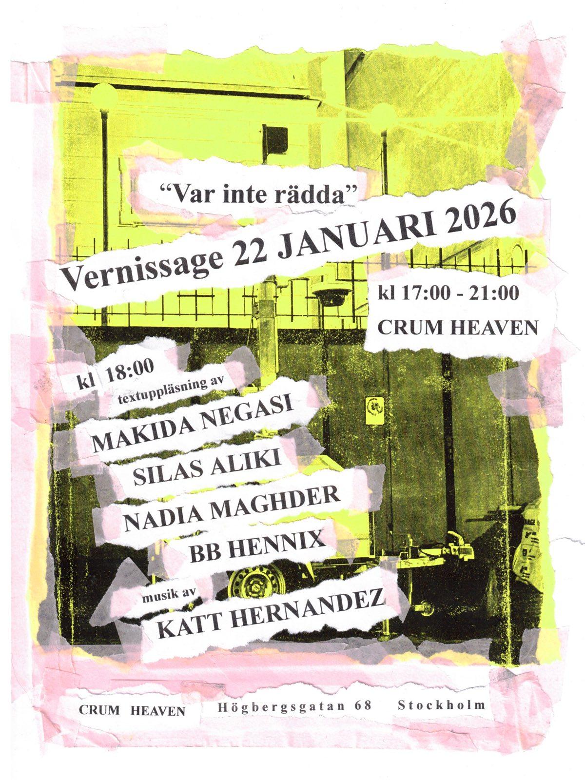 This Thursday! B.B. Hennix has invited me to join with others in performing at his gallery opening. "Var inte rädd" (Don't be afraid), about the growing violence of the police, security and surveillance state opens at 17:00, and readings and performances will start around 18:00.