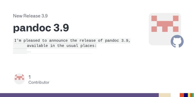 I'm pleased to announce the release of pandoc 3.9, available in the usual places: Binary packages & changelog: https://github.com/jgm/pandoc/releases/tag/3.9 Source & API documentation: http://ha...GitHub