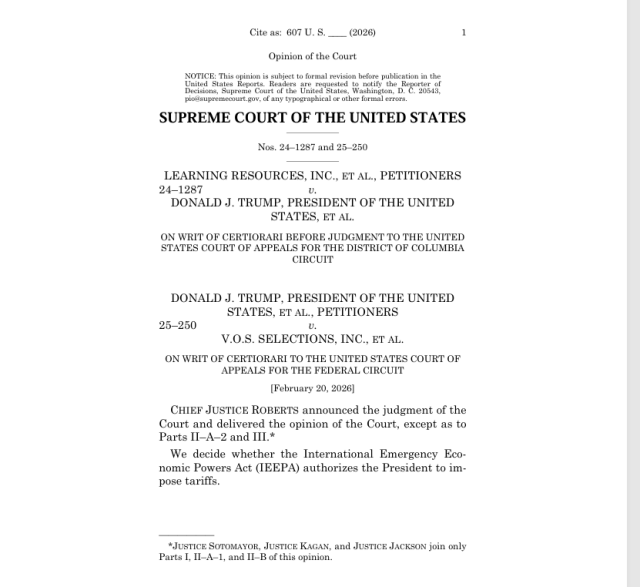 Attached: 1 image 🔥SCOTUS Knocks Down Trump’s ‘Emergency’ Tariffs in 6-3 Decision - #USPol #TrumpTariffTax #Tariffs #SCOTUS Opinion, concurrences, and dissents: :PDF: https://www.supremecourt.gov/opinions/25pdf/24-1287_4gcj.Paul Chambers🚧 (oldfriends.live)