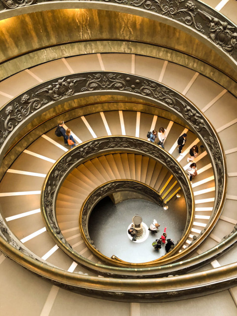 Looking down the Bramante Staircase in the Vatican museum. The staircase is actually a double helix design which includes seperate ramps (up and down) that don’t connect with one another.