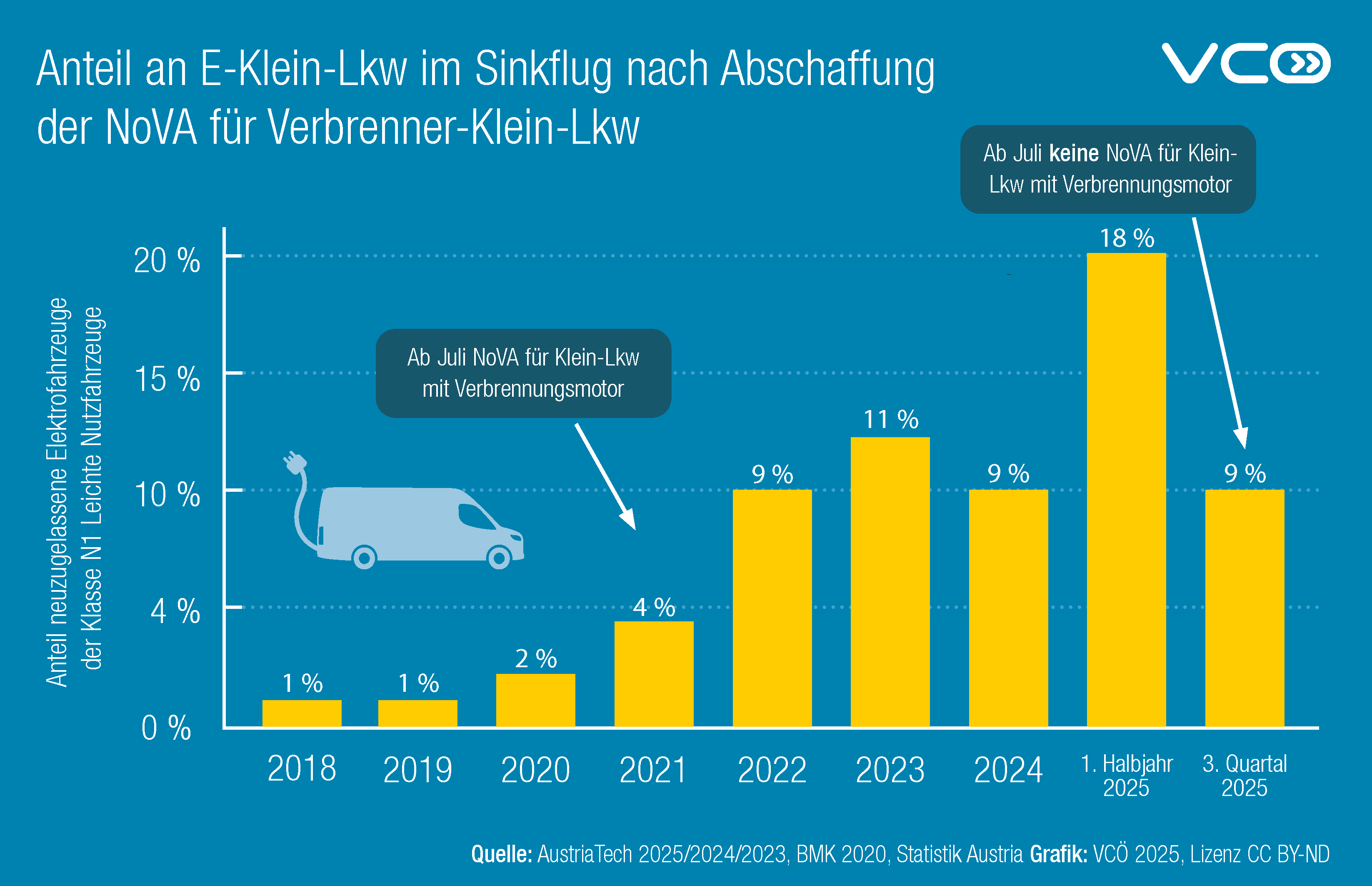 Mit Juli wurde für Klein-Lkw mit Verbrennungsmotor die NoVA (Normverbrauchsabgabe) wieder abgeschafft. Die Folge: Der Anteil der Elektro-Transporter brach ein. Mehr Diesel-Transporter bedeutet mehr Ausstoß von Feinstaub, Stickoxiden und CO2. #verkehrt PS: In den Niederlanden fahren über 80% der neuzugelassenen Klein-Lkw mit Strom vcoe.at/presse/presseaussendun…