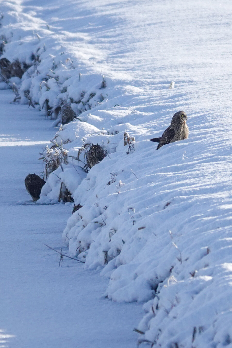 Walking in winter wonderland. I walked through the mist between the grass fields covered with snow and frozen ditches. The sun broke through and four short-eared owls were sitting in the shade by the water's edge. As I was watching them, a fifth flew in and landed on the frozen ditch between me and the four short-eared owls. The landed short-eared owls looked at me with a piercing gaze. Apparently time to move on.