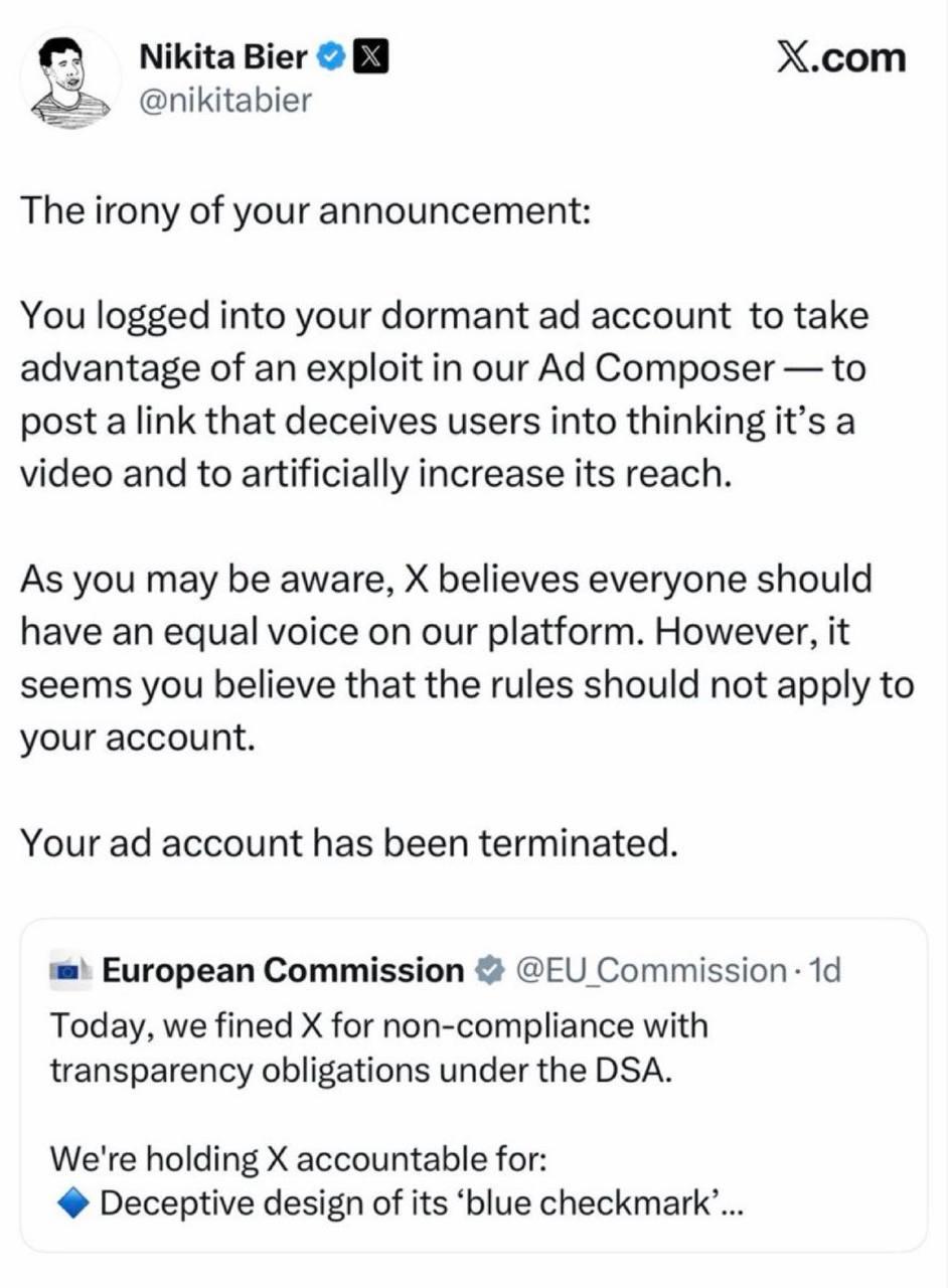 After being fined a hefty $140,000,000 for censorship issues with the EU, spiteful Elon Musk, X, terminated the ad account of European Commission